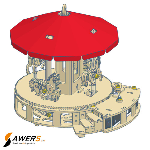 El kit didáctico educativo - CARRUSEL es un modelo en miniatura completamente funcional de un carrusel, y al mismo tiempo es un excelente kit didáctico para armar, aprender conceptos mecánicos y practicas destrezas manuales, apto para niños y niñas (se recomienda la supervisión de un adulto) o para personas que deseen tener este emblema de diversión.